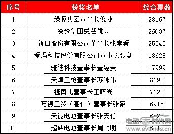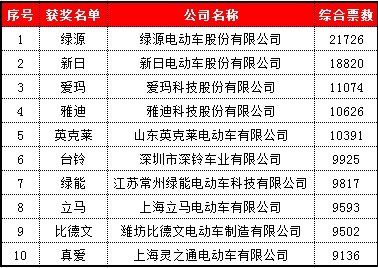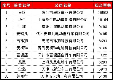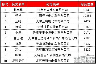 2012年10月20日,在业内人士聚集的第30届中国江苏国际自行车电动车以及零部件交易会上,电动车时代网正式公布的评选结果,结果如下:
