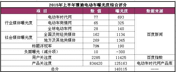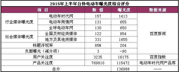 本期统计针对电动车各品牌在2015年1月至6月份的网络曝光度、用户关注度和产品关注度等方面进行综合考评,以动态评估各品牌在消费者中的口碑及影响力。
