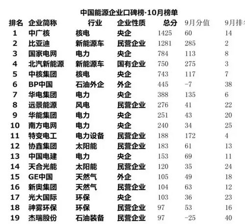 综观10月份中国能源企业口碑总体提升的原因,在于:一些能源企业走出去“开疆扩土”获得了高度关注,比如中广核和中核集团在欧洲的一系列动作,为他们赢得了榜单第一和第五的位置。另外,一些企业三季报相继出炉,其中业绩优良的信息也为自己获得正向分增加了砝码。