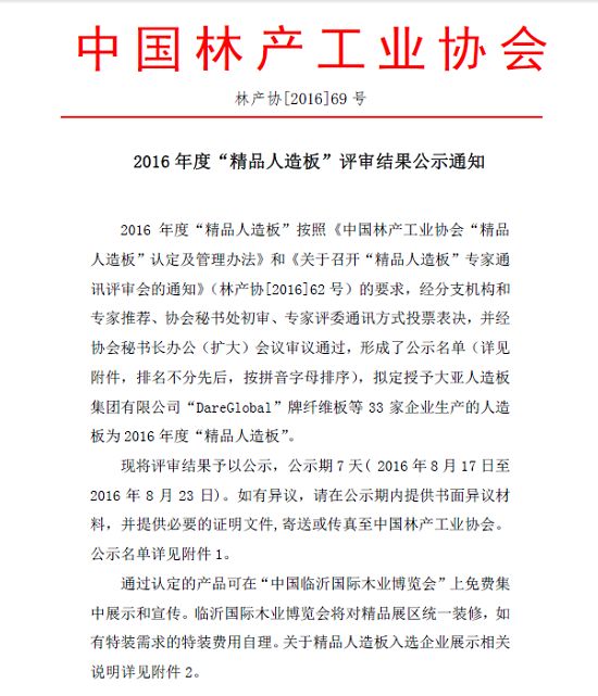 再获喜讯:莫干山饰面人造板被评选为“2016年度精品人造板”