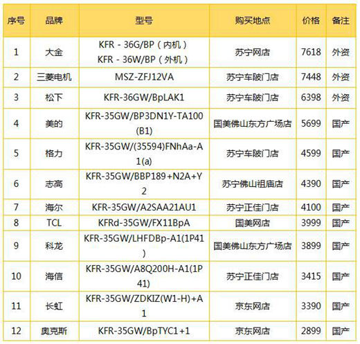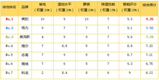 本次比较试验抽取了格力、美的、大金、三菱电机等12个消费者较为关注的品牌,并对消费者最关心的省电、温控、智控、静音、制冷和智能等六个方面共12个项目进行检测并评分。最终,美的空调以9.25的综合得分位居综合排行榜榜首。