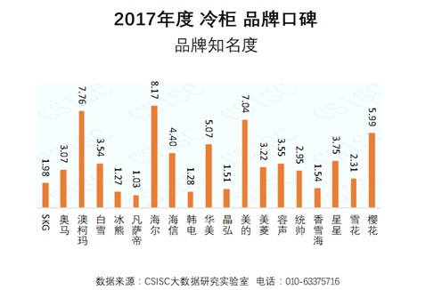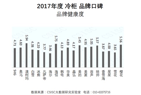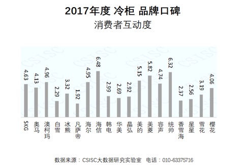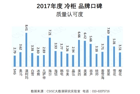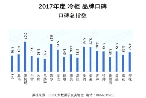 中国质量新闻网讯 CSISC大数据研究实验室基于国统•首页HOMEBA平台数据和大数据技术手段,以第三方视角,从国内冷柜市场中筛选出19个表现比较突出的品牌作为研究对象,包括:SKG、奥马、澳柯玛、白雪、冰熊、凡萨帝、海尔、海信、韩电、华美、晶弘、美的、美菱、容声、统帅、香雪海、星星、雪花、樱花(以字母顺序名次),综合运用网媒、电商、论坛等网络数据,通过品牌知名度、企业美誉度、品牌健康度、质量认可度、产品好评度、消费者互动度等六个维度对这20个冷柜品牌进行了品牌口碑指数评价,形成了《2017年度冷柜品牌口碑研究报告》(以下简称“报告”)。