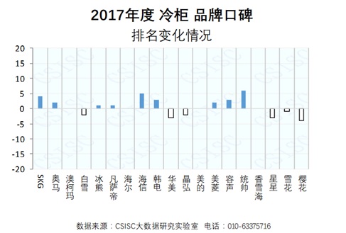 2017年度冷柜品牌口碑总指数榜单中,数据显示,澳柯玛、海尔、美的品牌在口碑总指数中位居前三。澳柯玛、海尔、美的、美菱、海信、容声、星星、樱花、华美在近两期中表现稳定,口碑总指数位居前十。统帅在本期口碑总指数中有强劲表现,晋升至前十,新飞则在本期口碑总指数中掉出前十。
