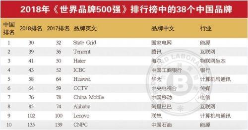 由世界品牌实验室独家编制的2018年度(第十五届)《世界品牌500强》排行榜于12月18日在美国纽约揭晓。中国入选的品牌只有38个,与经济第二大国的地位并不匹配。其中,国家电网排名第一,腾讯和海尔位列第二和第三。此外,还有中国工商银行、华为、中央电视台、中国移动、阿里巴巴挤进全榜单TOP100。
