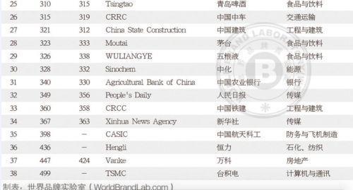 上榜的知名品牌还有:联想(第102名)、百度(第230名)、中国联通(第236名)、中国电信(第245名)、青岛啤酒(第310名)、茅台(第323名)、五粮液(第326名)、人民日报(第349名)、万科(第447名)。