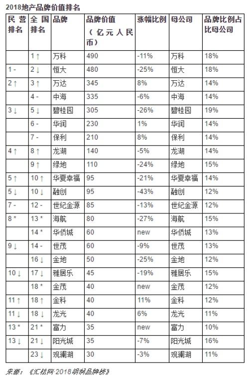 具体来看,在23个上榜地产品牌中,万科取代恒大成为最具价值地产品牌,品牌价值490亿元;排名第二的恒大,品牌价值比去年下跌25%到480亿元;万达进入前三,品牌价值比去年上涨7%至345亿元。