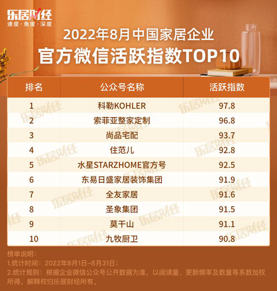 8月家居企业官方微信活跃指数TOP10中,科勒KOHLER、索菲亚整家定制、尚品宅配跻身前三甲。第四到第十分别为:住范儿、水星STARZHOME官方号、东易日盛家居、全友家居、圣象集团、莫干山和九牧厨卫。