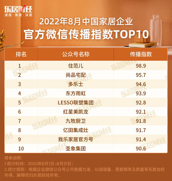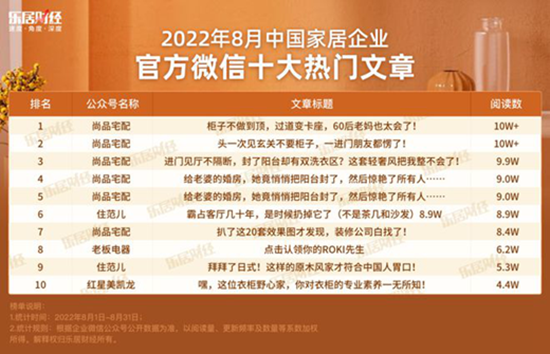 2022年9月,乐居财经发布《中国家居企业官方微信影响力月度排行榜》。在本期出炉的8月份榜单中,上榜30家企业公众号8月份共推送文章836篇,总阅读量约321万。