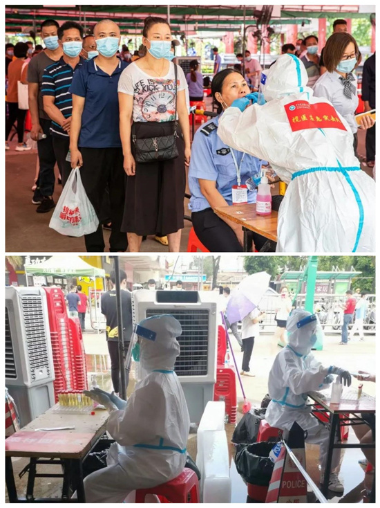 在核酸检测采样现场,在工作人员、志愿者的指引帮助下,市民们积极配合、有序排队,医务人员们加班加点地开展采样工作。在炎热的天气下,医务人员防护服早已被汗水浸透。为力保高效率完成任务,不少检测采样点从清晨运行至深夜, 致敬这些汗流浃背的身影。