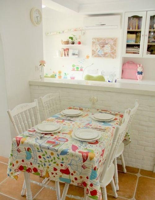 具有亲和力的一个餐厅布置,单靠餐桌上的一块桌布就能成为整个餐厅的亮点。原本简洁纯白的桌椅顿时有了如童趣般的生机与活力,半高的隔断墙划分出区域却又不阻隔视线。