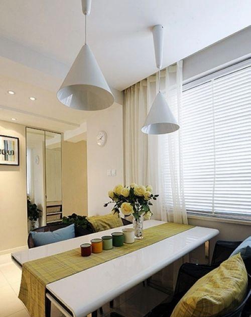白色的餐桌与黑色的餐椅搭配出经典的时尚之风,紧靠窗边的位置让阳光倾洒进来,百叶窗帘形成半遮半掩的朦胧光线。