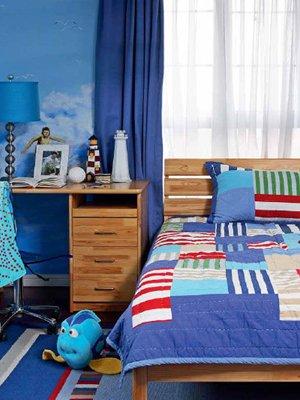 装饰搭配技巧二:以天空为背景墙,海蓝色点缀在被子、地毯(地毯装修效果图)上,窗帘(窗帘装修效果图)、玩偶、台灯灯罩都是海蓝色,在这里,海蓝色与天空蓝齐头并进,仿佛闭上眼睛就能听到海风呼啸和海燕鸣叫,空间色彩用得妙,想象的世界便大了!