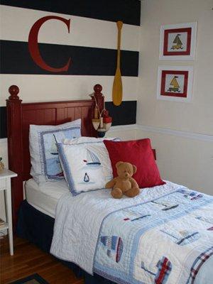 装饰搭配技巧三:海军蓝与白间条,简单素净,其简洁的线条,平和的色彩,可以无形中让孩子学会平静心理,对走向成熟的小孩再适当不过了。当然,整洁之余,嬉皮精神也弥漫出来,墙上隔板的趣味玩具,演绎另一番个性就是体现。
