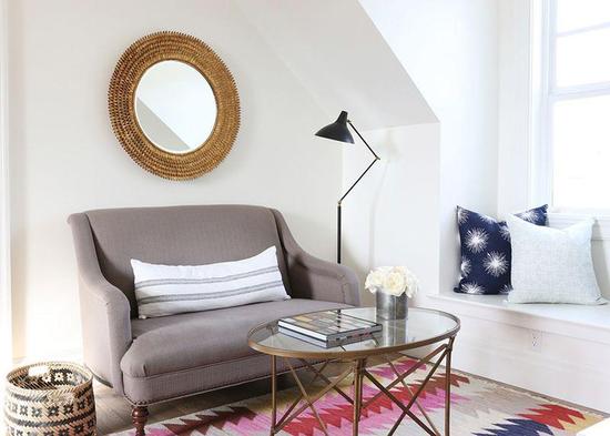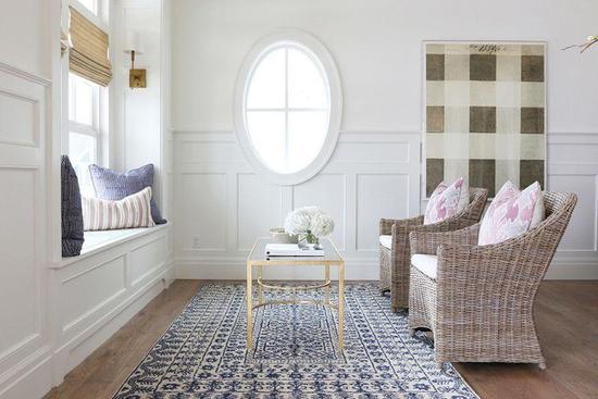 正对飘窗的藤编椅子搭配原木茶几与地毯,温暖明媚的同时,却不显得单调无聊。