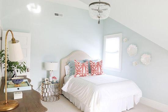 浅蓝色的墙壁和鲜艳的靠枕更适合小孩的天性,也相比于白色更耐脏。