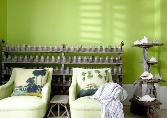 古老的树干支架为客厅创造了工艺品展示平台,与沙发后面放满瓶子的支架一起为客厅营造出原始复古风味。绿色的背景墙与浅色沙发和谐搭配,让客厅充满清新自然的味道。