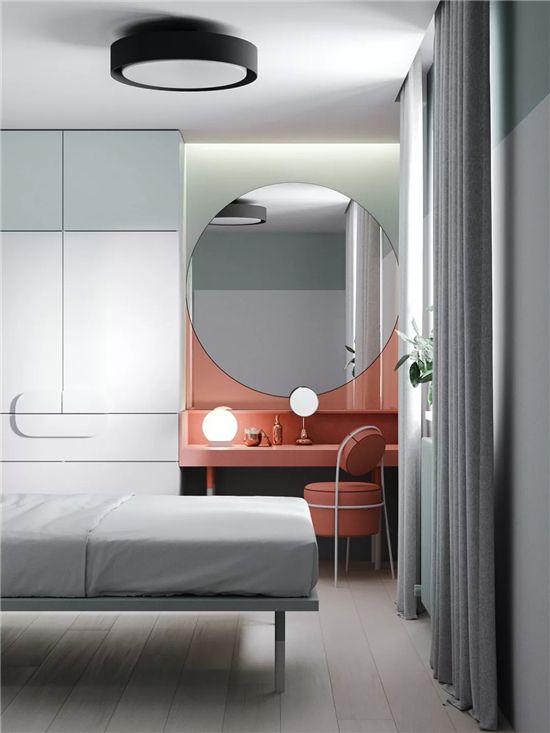 床头不宜对着镜子,因为镜子反射其他事物,当人在意识模糊的状态下,看见镜中的影像可能会因此受到惊吓。建议在衣柜里加穿衣镜,平时衣柜门关上看不到,也不需要占用卧室空间。