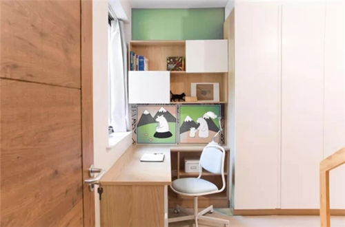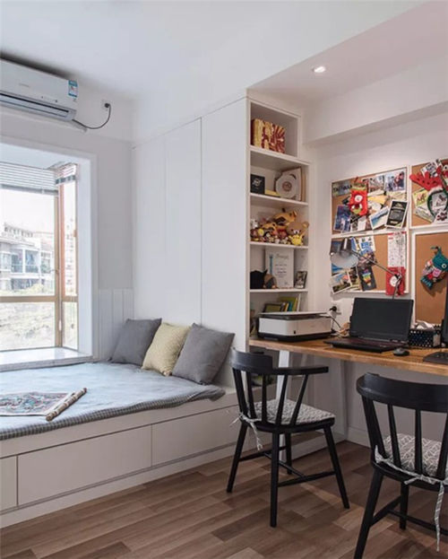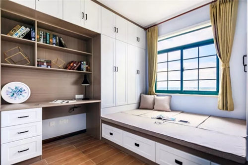 ▲ 榻榻米搭配书柜和书桌的设计是小户型次卧很常见的搭配。