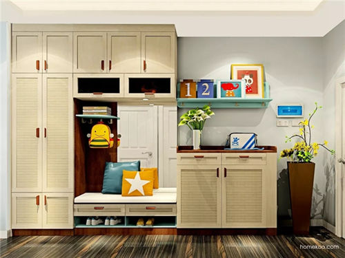 ▲孩子的鞋比较小,活力黄的开放层板刚好够放孩子的小鞋子,孩子坐在换鞋凳上换好鞋之后,随手就可以放到层板上,无形中培养了小宝贝的“自己事情自己做”。