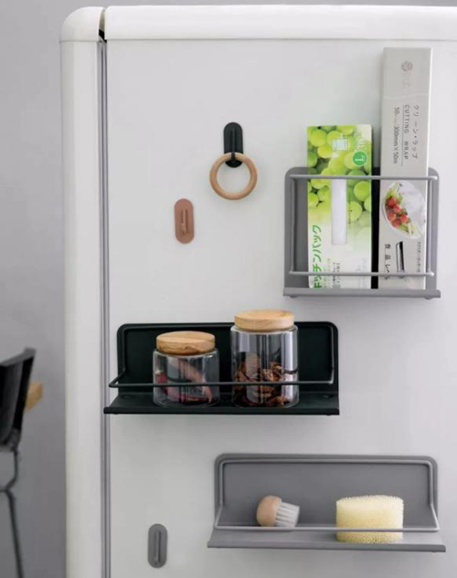 这个时候就可以在冰箱外门装一个外侧空间,可以用来放置一些餐巾纸啊,厨房用纸啊等比较轻的日常物品,一伸手就可以拿到了,还可以放置收纳袋,收纳一些零零散散的小物件可以说是非常方便的