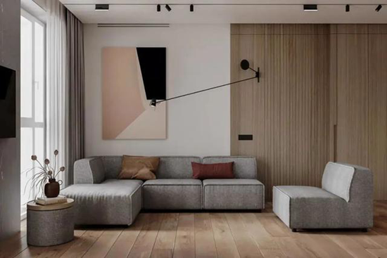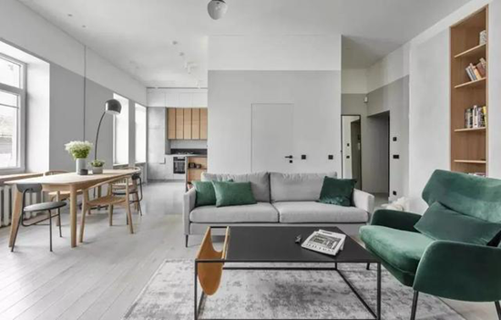 除了墙面与木地板的颜色搭配,家具作为占用大面积墙面的存在,颜色建议比地板略浅,否则有失和谐,显得不稳定;若是有大面积的定制柜体,柜体要与地板颜色统一色系,保持视觉的延伸,否则反差太大,会让空间分割太细,显得不和谐。