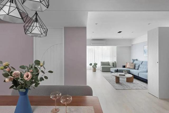 从地面到墙面,再到天花,遵循"墙浅地中家具深、墙中地深家具浅",颜色依次变浅,会给人营造出和谐自然的层次感与空间感,同时不会显得头重脚轻。