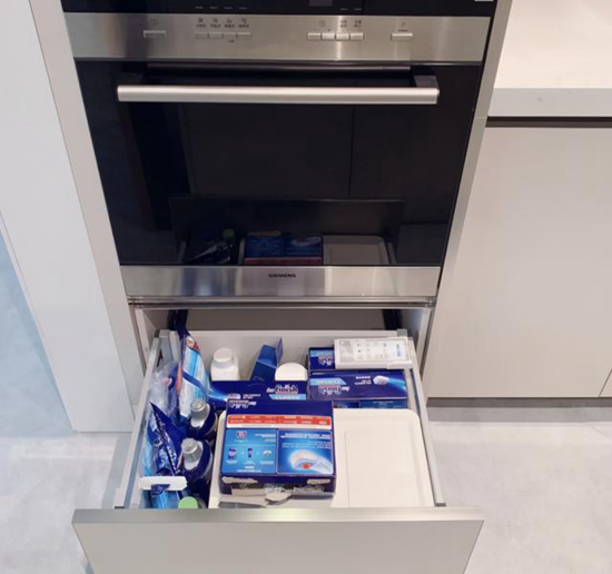 如果你家的洗碗机、烤箱做的是嵌入式的,那么在做这类橱柜时可以考虑在下方增加薄抽,提高收纳,放烤箱手套、锡箔纸等随手可取的东西。