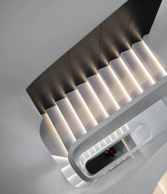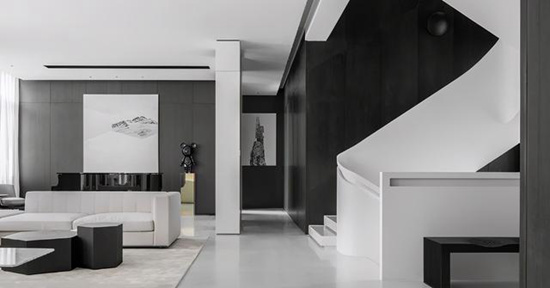 这是一处780㎡的三层别墅,同样采用了黑白的极简概念,在处理手法上主张“流动空间”和“全面空间”交错,设计师运用光线和线条的特性,删繁就简,使空间层次逐级递进,以黑白打破常规的设计手法,空间自身的功能和形式,既返璞归真,又有条不紊。