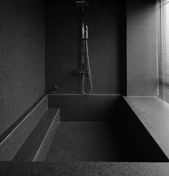 白色石材的餐桌、白色烤漆的餐柜、白色水泥砖,搭以黑色水磨石基调的浴池,保留黑色的神秘感,一处又一处的黑白应用,对立且统一,不愧是色彩的最终抽象。