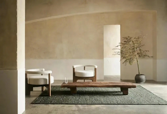 如果说奶油风是温柔的日常,那侘寂风就是一场静谧的修行。它源自东方哲学,崇尚“不完美中的完美”,接受时间留下的痕迹、手工的瑕疵、材质的粗粝。2026年的侘寂风已脱离早期的“毛坯感”,进化为一种更高级的“疗愈美学”。色彩遵循大地的节奏:40%米白打底,30%浅灰过渡,20%檀木棕定调,再以5%铁锈红与5%苔藓绿唤醒生机。