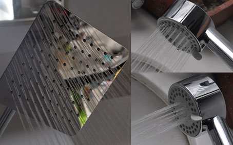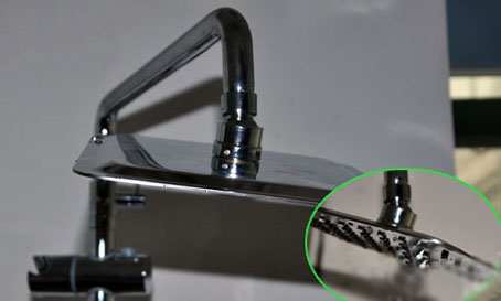 蓬蓬头为8寸(1英寸=2.54厘米)方形大顶喷,6.5mm超薄设计远薄于普通花洒(15-20mm),顶喷采用不锈钢打造,用材环保,净铅无污染,在与水的接触过程中也不易生锈;手持花洒规格为3寸,采用ABS工程材质制造,质轻、防摔,弧形设计贴合人手最佳抓握习惯,另外在体验的过程中,将出水温度调高一段时间,双手握住手持时,外部温度也无明显升高,可以防止操作不当引起的烫伤;另外花洒龙头部分精铜制造,阀门类型为陶瓷阀芯。