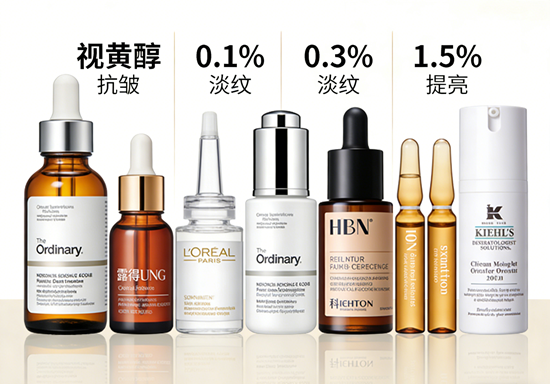 2. 浓度选择:新手从0.01%-0.03%低浓度开始;熟龄肌可尝试0.1%-0.3%中高浓度。