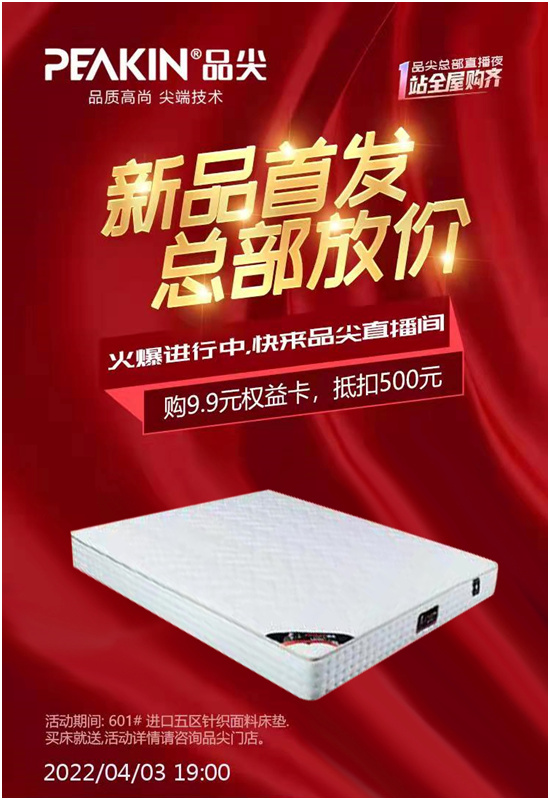 在直播当天,品尖将推出专业设计师推荐的超级套餐惊爆价,“床+垫”的组合套餐,帮你解决选择的困难。每个套餐组合都由专业设计师设定,最时尚的套餐组合可以完美搭配各种装修风格;更是用总部最大力度的补贴,让消费者轻松享受好睡眠。