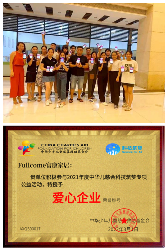 同样作为爱心企业Fullcome富康家居潘总也表示,Fullcome富康家居是一家经营家居用品的企业,经国家相关部门批准注册,主营现代家居用品沙发、台椅、床等系列,公司本着“客户优先,诚信至上”的原则,在行业内有着良好的口碑,目前发展成为集研发、生产、销售、服务于一体的现代化家居企业,致力于为中国家庭提供舒适、环保的家居一站式解决方案。多年来,在企业稳定发展的同时,始终不忘履行企业社会责任,这次全程参与到中华儿慈会科技筑梦专项公益活动,也是公司上下员工对边远贫困地区儿童一份爱心,希望通过公益帮扶温暖更多的孩子。
