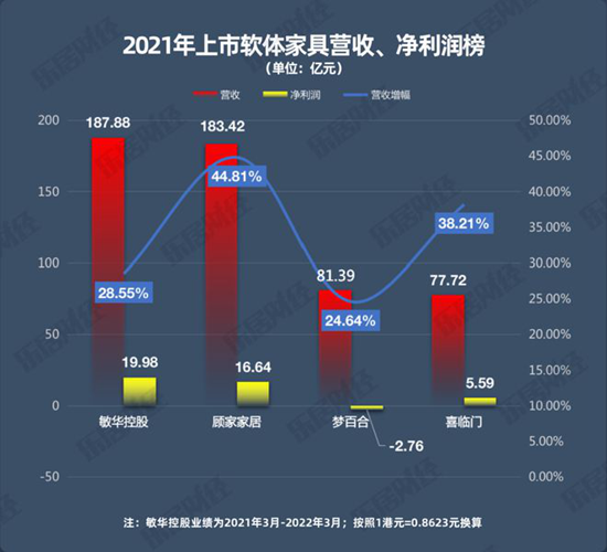 从增速来看,顾家家居以44.81%的增幅居于首位,敏华控股在2022财年的营收同比增长28.55%,喜临门和梦百合的营收在2021年分别同比增长38.21%、24.64%。