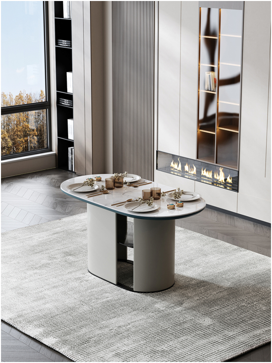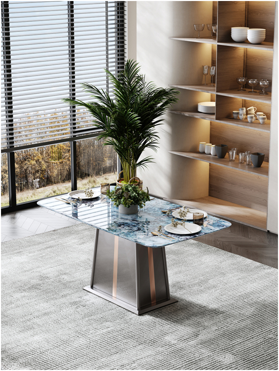 一张设计感强的洛品有家餐桌,流畅的线条,细腻的质感,完美贴合人体工程学的造型设计,桌子高度和手感恰到好处,让人安全感十足。餐桌的大理石桌面,保留了独特天然的纹路,清晰自然,犹如把大自然的曼妙带入家居生活中,构建出惬意、唯美的灵性空间。