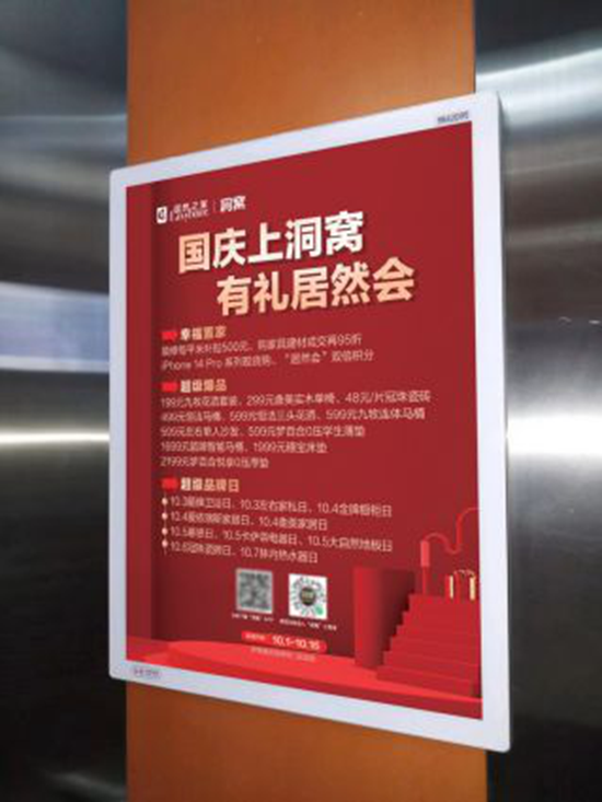 适逢国庆销售旺季,各大家居品牌施展浑身解数抢占黄金周,居然之家旗下洞窝平台登陆分众电梯媒体,推出多重优惠活动,激发消费潜力。与此同时,借助分众在城市主流消费人群中的影响力,加持平台拉新,提升品牌数字化竞争力。