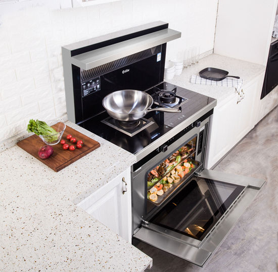 说它节省空间,首先是它省去了传统吸油烟机上置占用的空间,可以多打一个储藏吊柜;其次是它下方集成功能,将原本需要占据空间外置的小家电纳入其中,大大提高了厨房空间的利用率。