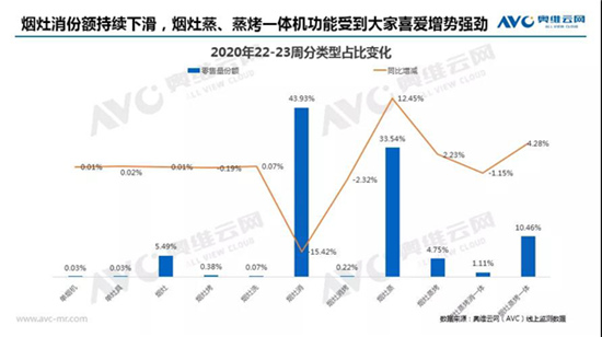 据奥维云网(AVC)推总数据显示,2020Q1整体油烟机市场零售额同比下滑51.7%,燃气热水器同比下滑48.0%。但从2020年4月份开始,厨电市场开始回暖。在厨电品类上来看,以洗碗机、嵌入式、集成灶等新兴多功能一体机品类率先复苏。成为厨电行业在疫情发展下的主推动力。