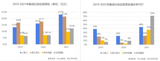 四大集成灶供应商中,浙江美大营收常年位居首位,但火星人营收增速远超其它公司。2020年,受疫情影响,各企业营收增速均有所下降。随着疫情受控,2021年迎来拐点,受益于工程渠道、整装渠道、KA渠道,下沉渠道等新兴营销渠道快速发展,叠加产品出新速度快,火星人以23.19亿元的营收位居第一,首次超越浙江美大(21.64亿元)。出人意料的是,亿田智能2021年实现营业总收入12.3亿元,同比增长71.7%,增幅创5年新高,一度超过火星人(43.65%)。2021年,亿田智能联合阿里展开技术合作,推出行业首款真正意义上具有成熟语音交互功能的“天猫精灵蒸奇妙”集成灶,一定程度上提振了品牌影响力及竞争力。