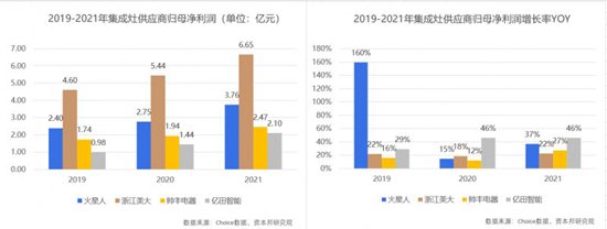 而在盈利方面,浙江美大仍独占鳌头,2021年归母净利润达6.65亿元,远超排名第二的火星人(3.76亿元)。近几年四大供应商归母净利润均稳步增长,2020年的疫情对各公司的生产经营产生负面影响,直接导致归母净利润增速有所减缓(2020年亿田智能归母净利润同比增长46%得益于**补助0.2亿元,扣非后归母净利润增速为27%,较2019年的29%有所下降)。其中,由于火星人销售模式发端于线下经销体系,其线下门店数量远超于其它三大供应商,疫情给火星人带来的冲击影响也较强,其归母净利润增速大幅下跌。随着国内新冠疫情态势得到有效控制,公司供、产、销等各项工作均有序开展。2021年,各公司均加大电商渠道投入,生产经营逐渐回归正轨,归母净利润增速也大幅上涨。