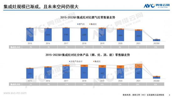 据奥维云网(AVC)推总数据显示,2022年第一季度,中国传统厨电(烟、灶、消)96.2亿元,同比下滑7.0%,集成灶零售额47.5亿元,同比增长19.5%。相较于传统厨电的疲软,集成灶发展势头可谓相当强劲。