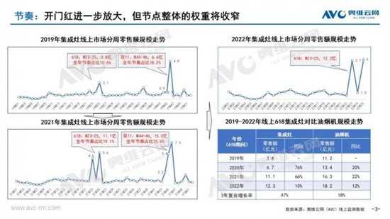而到了6月份,随着疫情逐步好转、物流恢复,加之为618蓄水品牌推广力度加大,部分抑制的需求得以释放,集成灶呈现增长态势。据奥维云网数据显示,2022年618期间,集成灶12.3亿元,同比增长10.1%(对比W1-22同比增长15.5%)。