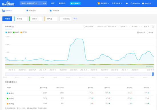 百度搜索指数显示: 最近一个月以来,「集成灶」 日均搜索量为3067 次,而「油烟机」 的日均搜索量只有1014 次,「燃气灶」 的日均搜索量为1048 次。这么算下来,「集成灶」 的网络年搜索量大约是1119455 次,「油烟机」 的网络年搜索量大约是370110 次,「燃气灶」 的网络年搜索量大约是382520 次。
