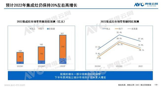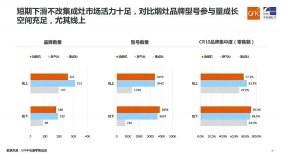 虽然短期内市场下滑明显,但集成灶市场整体活力十足。从油烟机、燃气灶和集成灶三大品类的品牌数量、品牌型号和品牌零售额集中度来看,集成灶品牌型号参与量成长空间充足,尤其是线上市场表现更为突出。 GfK中怡康预测,2022年集成灶市场将继续稳定增长,虽然对比去年整体增长率放缓,但整体规模仍有望突破300 亿元和357 万台,登上新的台阶。