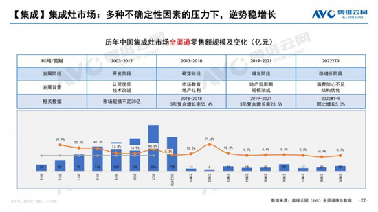 据奥维云网(AVC)全渠道推总数据显示,2022年1-9月集成灶零售额规模为190亿元,零售额同比增长5.3% ,集成灶产业已经步入稳增长阶段。