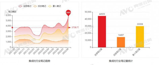 种草笔记呈明显上升趋势。 尽管集成灶行业可能面临“流量红海”,但是小红书仍然存在行业的“流量洼地”,有很大的用户红利。品牌在小红书的成长空间还很大,值得用心经营。奥维云网(AVC)火箭大数据显示,2021年8月31日至2022年9月1日,关于集成灶的相关笔记近4.4万,有明显的增长趋势,其中投放笔记有1.4万。对于小红书大部分行业而言,投放笔记的占比大约是25%,而集成灶投放笔记占比约为32%,品牌的竞争已经非常的激烈;
