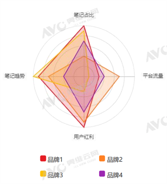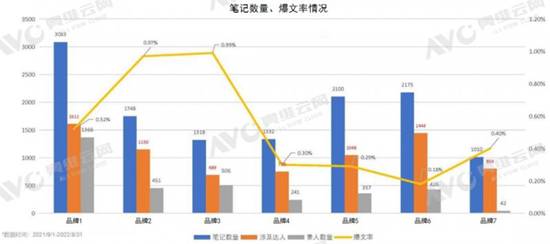 从笔记占比、笔记趋势、用户红利、平台流量等角度分别来评价各品牌的种草趋势,奥维云网(AVC)火箭大数据显示,2021年9月1日至2022年8月31日,品牌1的笔记占比(32%)最高,对应市场规模就越大;品牌3笔记量增长率为810%,相对大盘+743%,说明该品牌笔记趋势最优;品牌1素人自发笔记占比为92%,对应该品牌用户红利相对丰裕;用篇均互动量反映平台流量的分配情况,品牌2的平台流量最高,而品牌3可能植入太多热词,有可能被平台限流。