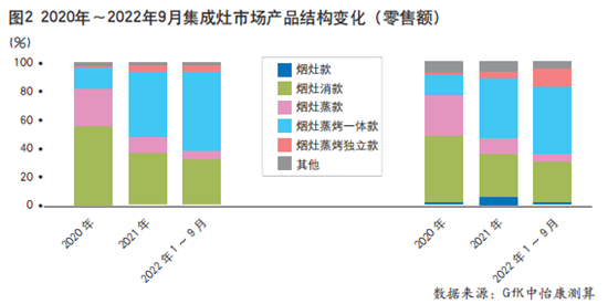 GfK中怡康监测数据显示,2022年1~9月,烟灶蒸烤一体机线下市场销售额占比为56.5%,相比2021年同期提升14个百分点;线上市场销售额占比达到47.3%,相比2021年同期提升5个百分点。烟灶蒸烤产品中,除了蒸烤一体之外,蒸烤独立产品也逐步进入市场,尤其是线上市场,蒸烤独立产品因功能齐全、专业性高,蒸烤效果好等优势备受消费者青睐,截至2022年9月蒸烤独立产品的线上市场比重已达到12.8%,相比2021年同期提升了12个百分点。此外,烟灶消类入门级产品仍保持着29.0%的市场份额(见图2)。