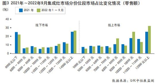 集成灶行业还在持续探索高端化道路。在新消费时代,消费者对品质生活的需求不断提升,具有优秀外观、专业烹饪性能、智能交互以及丰富多媒体娱乐功能的中高端集成灶产品应运而生。2022年1~9月,集成灶线下市场销售均价为10117元,同比提升233元,其中12000元以上的高端市场销售额占比达到48.8%,相比2021年同期提升了1.2个百分点;线上市场销售均价为7282元,同比上涨928元,其中10000元以上高端产品销售额占比达51.2%,相比2021年同期提升了11.9个百分点(见图3)。未来,随着集成灶产品力逐步提升、功能愈加齐全,市场高端化是必然的发展趋势。